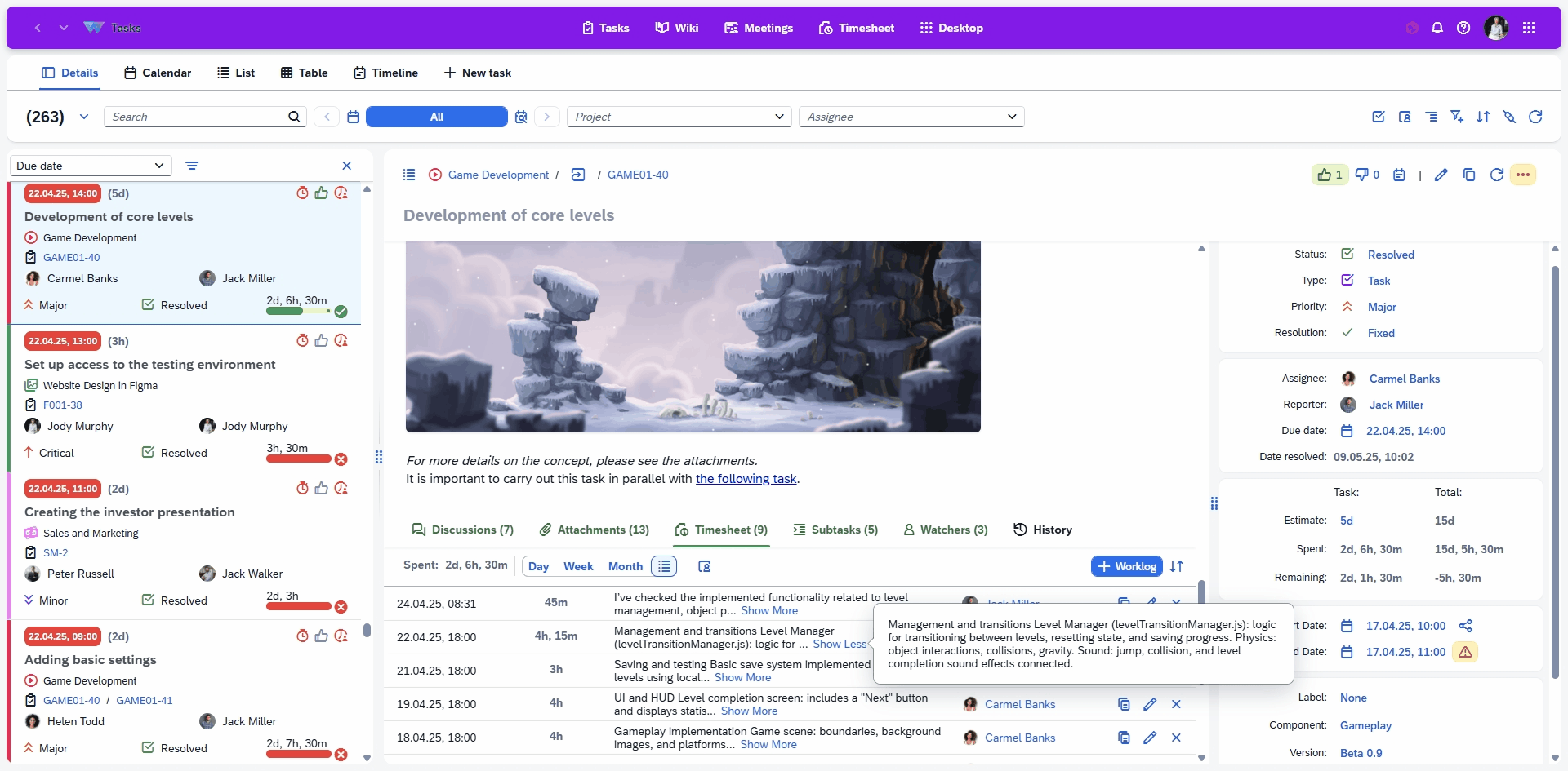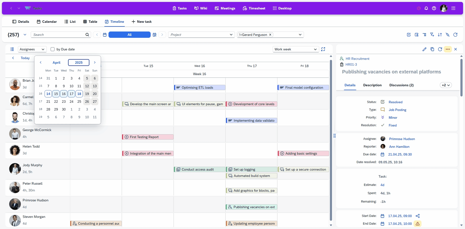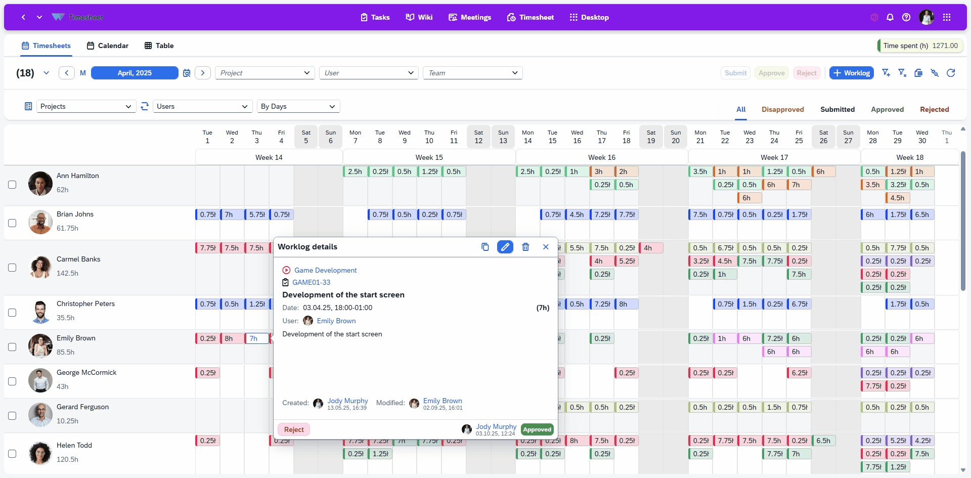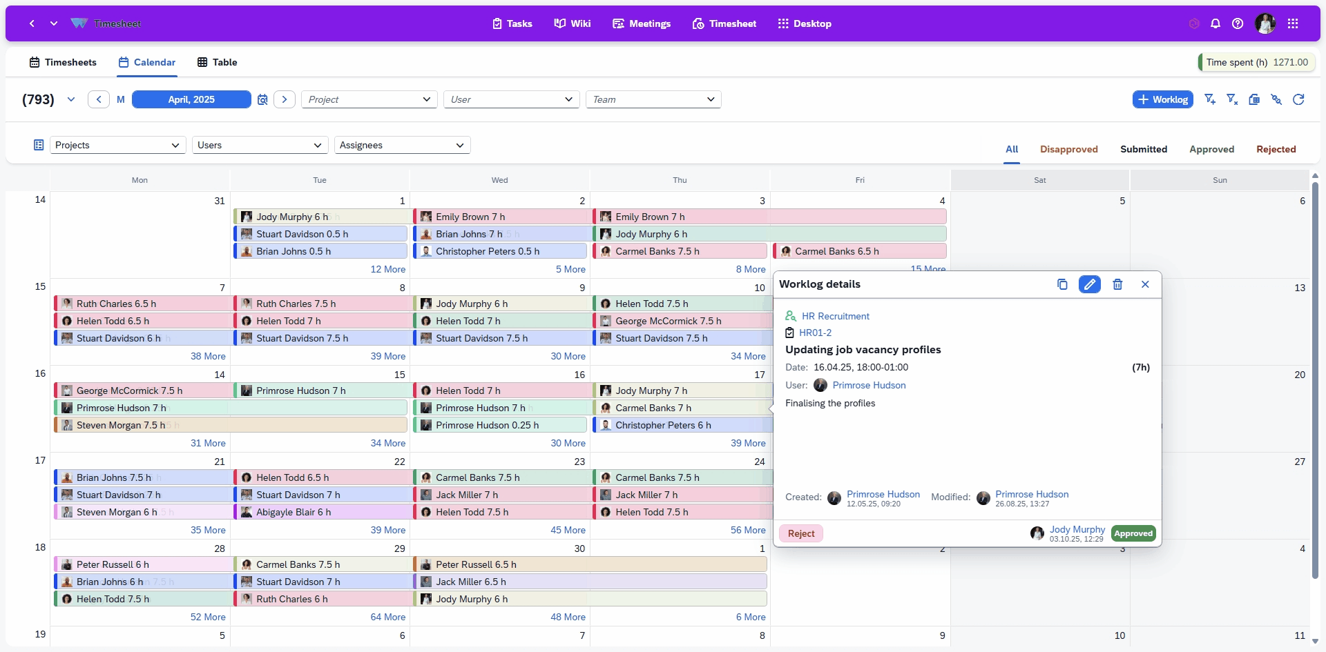 The application allows you to display an employee’s timesheet directly in the calendar — showing when they worked, at what time, on which task and what exactly was completed. Employees can fill out their timesheets right in the calendar, while managers get a clear, convenient view of all timesheets for analysis and approval.