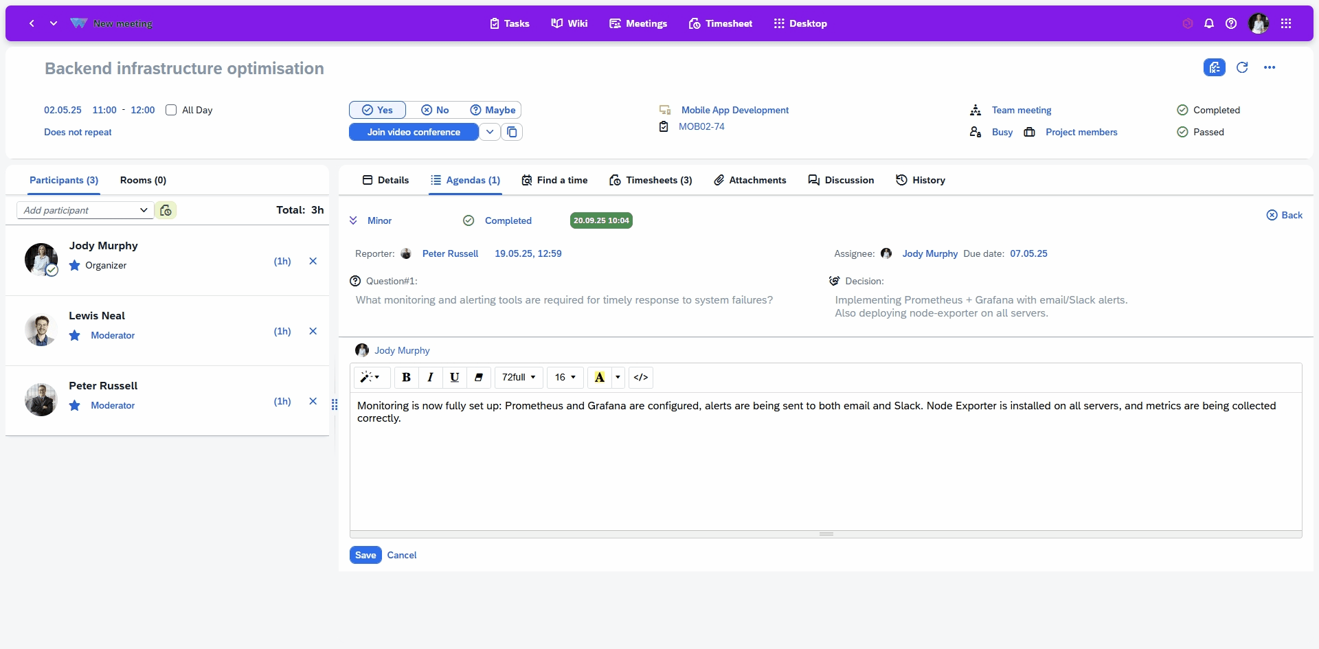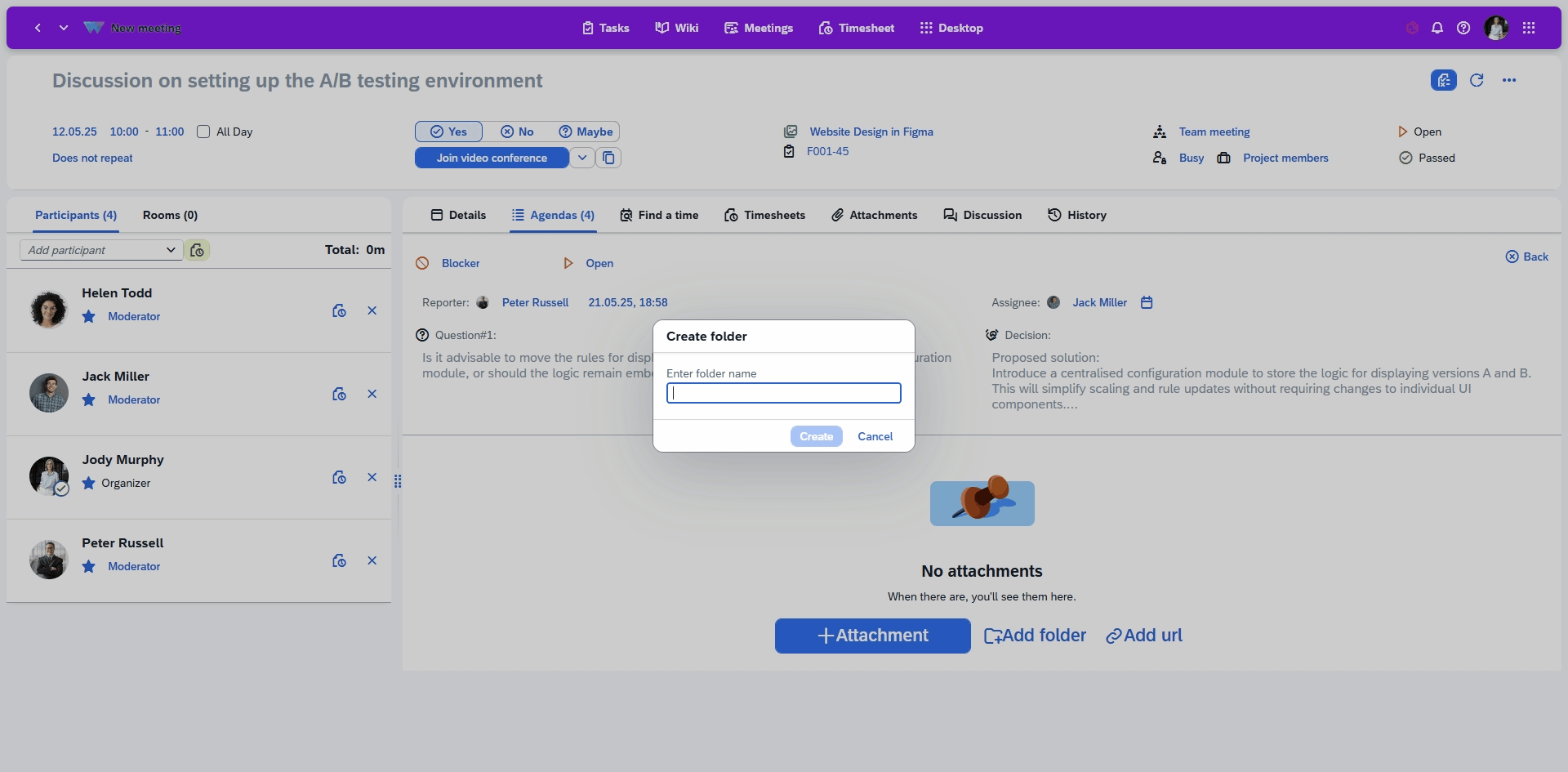 Create a meeting right in the calendar and specify all the necessary information: date, time and place, participants and their roles. Add an agenda for the meeting: issues for discussion, their priority and status. Use convenient tools for transparent planning and effective meetings.