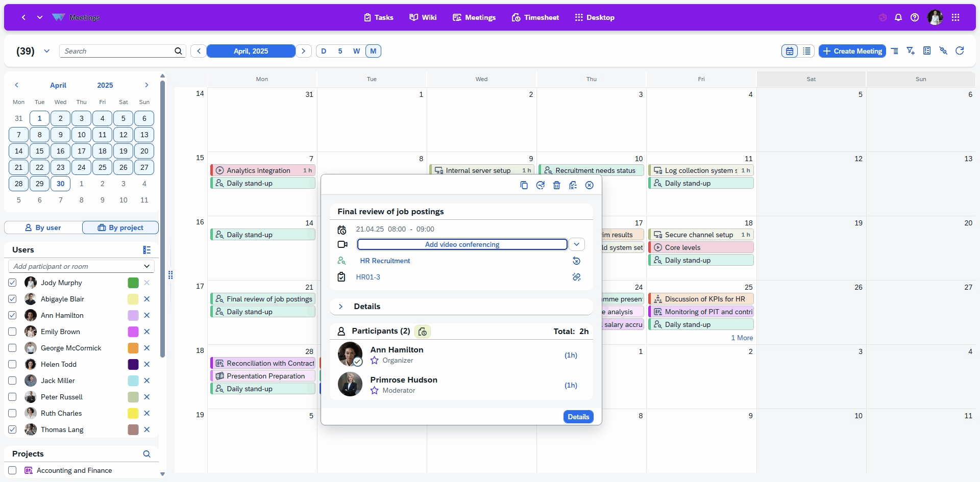 You have the ability to create meetings right in the calendar. The meeting you created will also appear on the calendar of the invited participants. Participants will be able to view the details of the meeting: time, description, agenda.