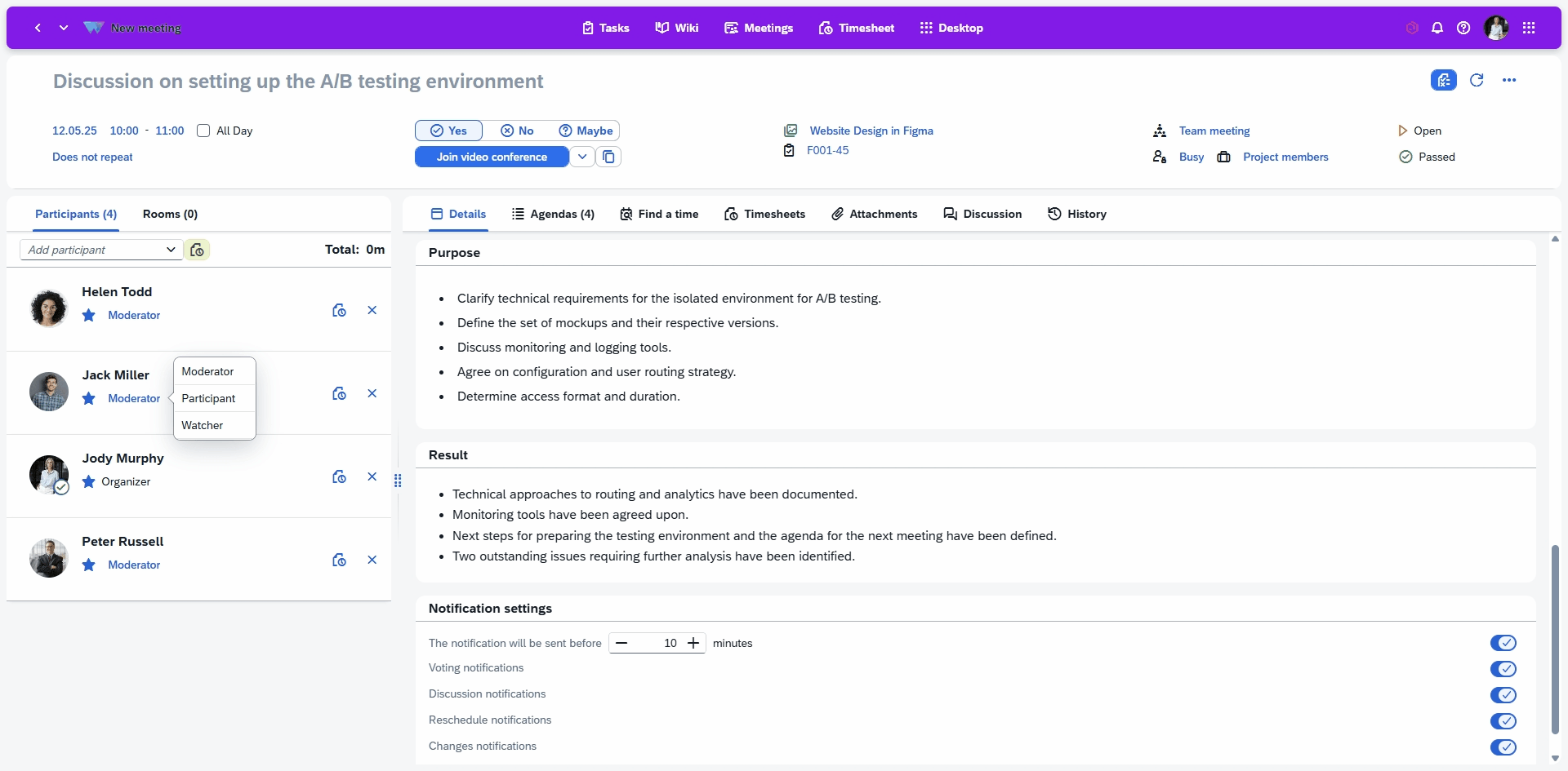 Internal meetings are suitable for discussing issues within your team or department. Prepare an agenda for the meeting, distribute tasks among those responsible, and have a productive meeting. At the end of the meeting, you can transfer all unresolved issues to the next meeting, and transfer the resolved tasks to the Closed status.