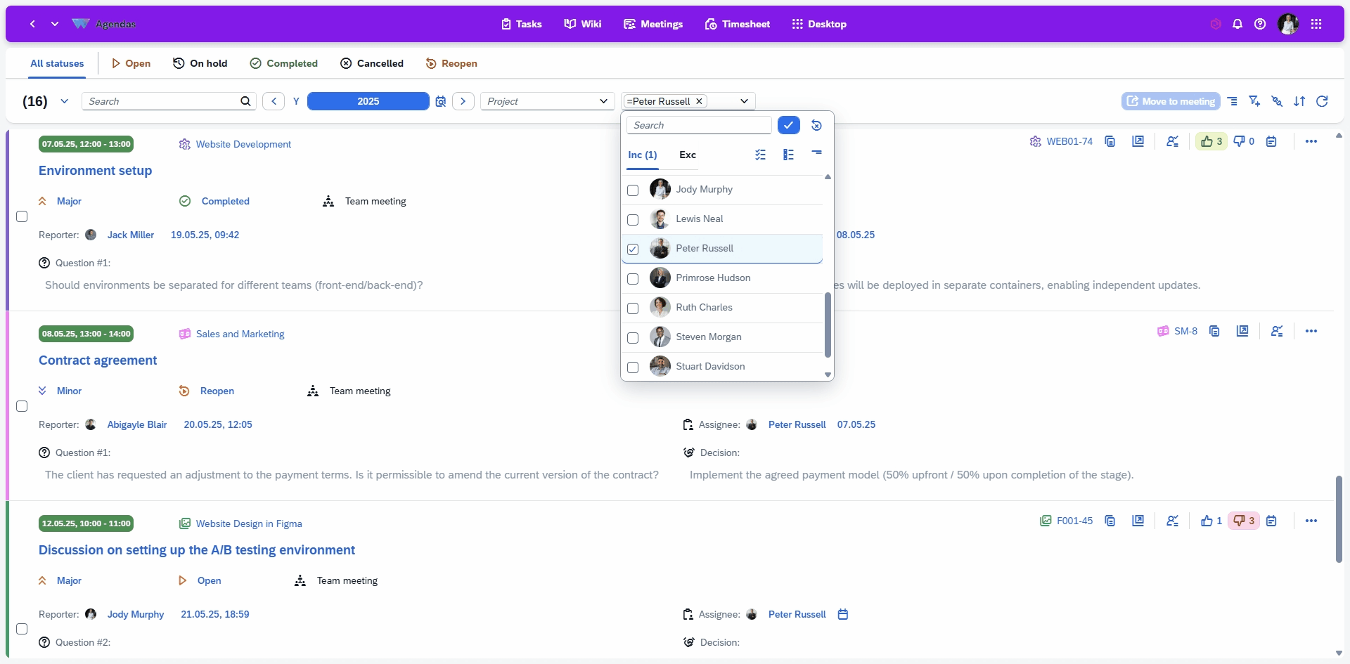 The Agendas application allows you to view all created and pending meeting tasks. Set up the filters you need and keep track of which agendas you are assigned to, sort them by projects, types or priorities. You can also view all created agendas by their status: see which of them have already been completed and which are in progress.